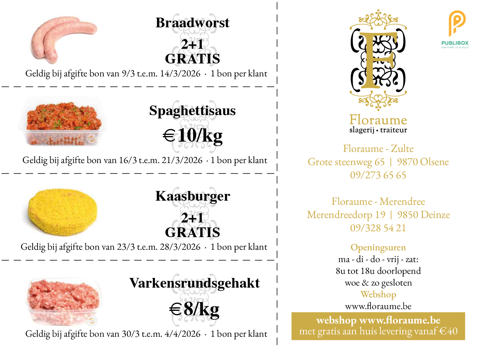 Bestel uw vlees 7/7 - 24/24 online bij Floraume. Selecteer de gewenste dag en uur van ophaling. Zo bespaar je tijd bij het bezoek van jouw slagerij!